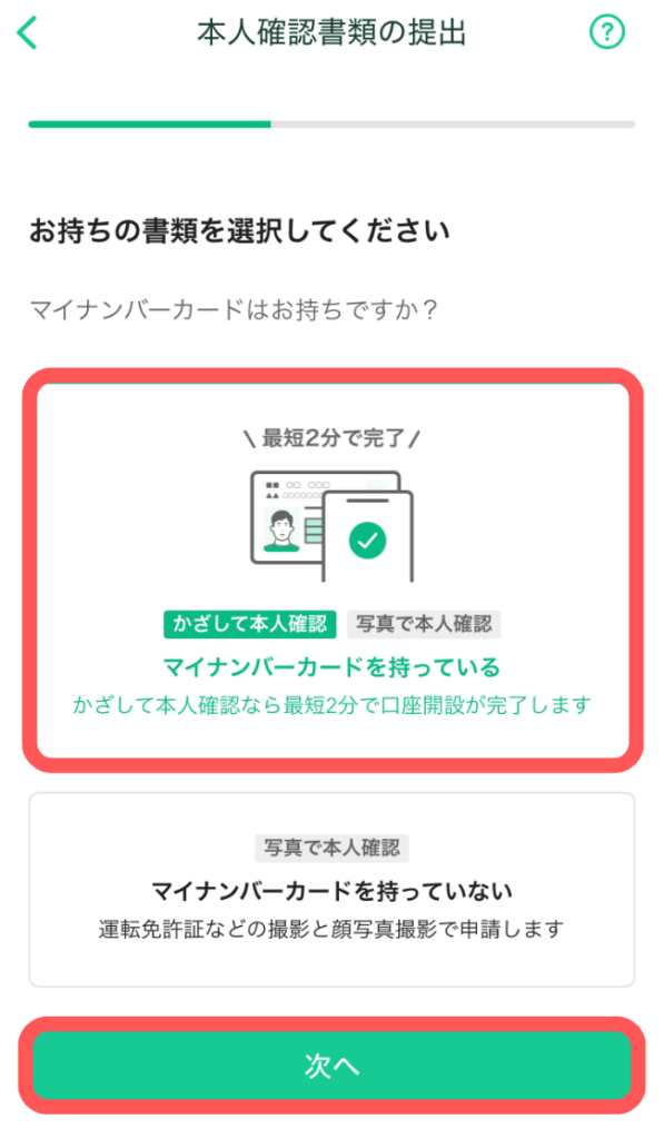 「マイナンバーカードを持っている」を選択し、「次へ」をタップ