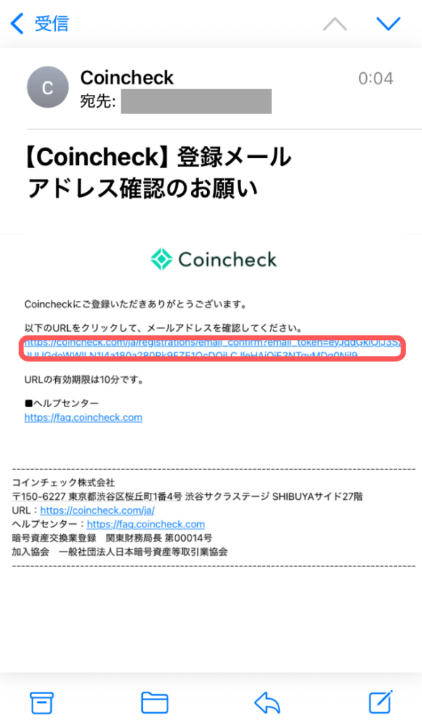 ④ コインチェックから確認メールが届いたら、本文に記載のあるURLを選択する。